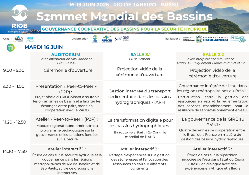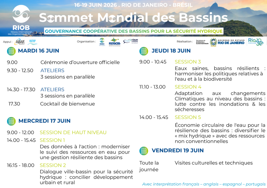 Le prochain Sommet Mondial des Bassins du RIOB se tiendra du 16 au 19 juin 2026 au Brésil, à l’invitation du Secrétariat d’État à l’Environnement et au Développement Durable de Rio de Janeiro (SEAS).